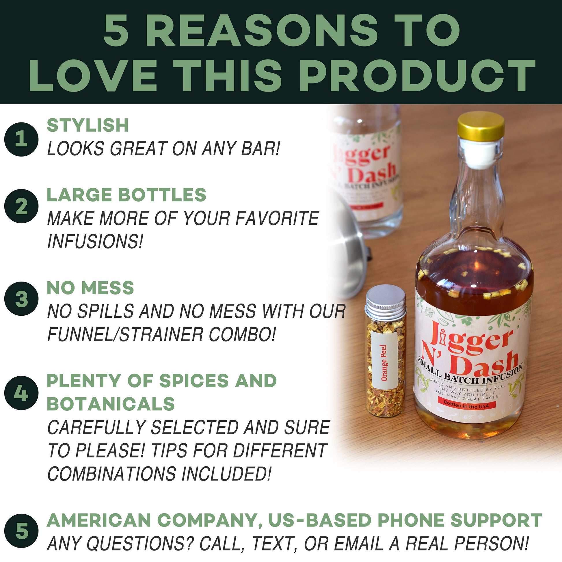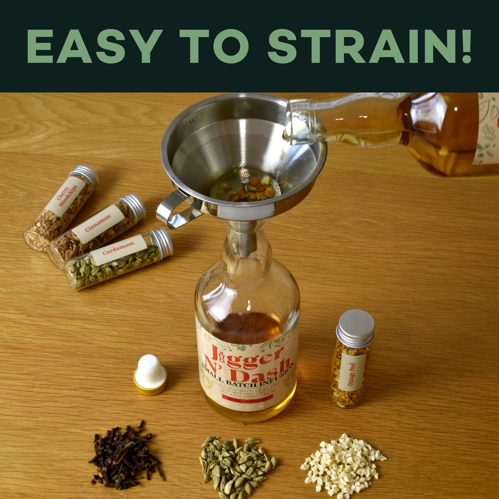 Other sets push you to use a coffee filter to strain and filter your infusion from one bottle to another, which just causes the spirit to bounce off the filter and spill onto the bar. Our version is no spill and no mess!